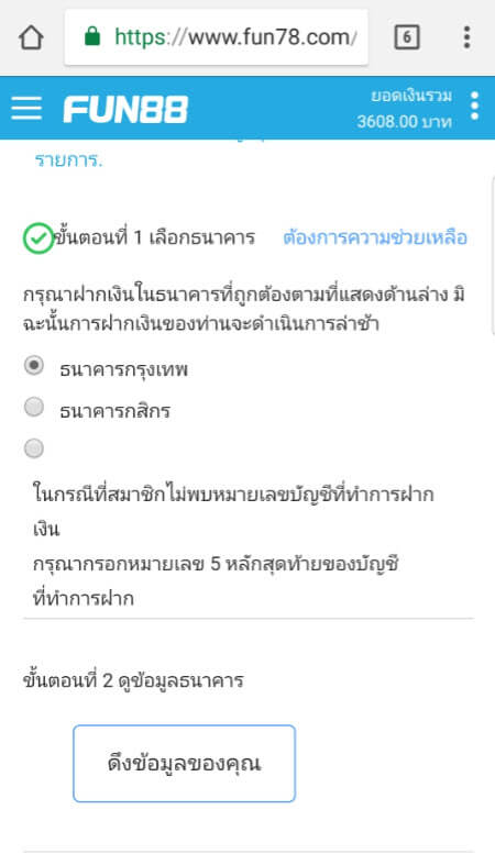 3.คลิกเลือกธนาคาร > ดึงข้อมูลเพื่อดูเลขที่ธนาคารของ Fun88 (หากท่านได้ทำการโอนเงินแล้ว ให้ไปที่ขั้นตอนต่อไปได้เลย)