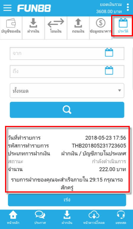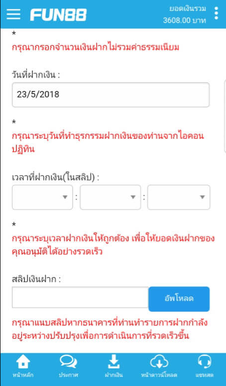 วิธีฝากเงินเข้าบัญชี FUN88 แบบบัญชีภายในประเทศ (มือถือ)