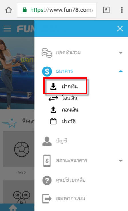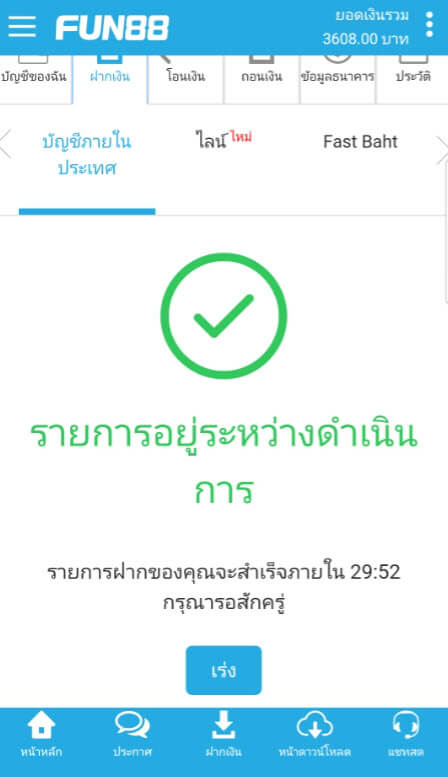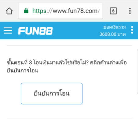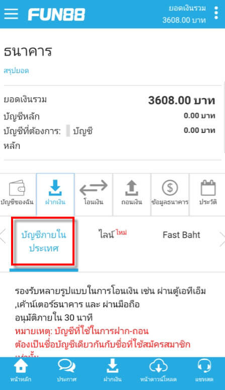 วิธีฝากเงินเข้าบัญชี FUN88 แบบบัญชีภายในประเทศ (มือถือ)